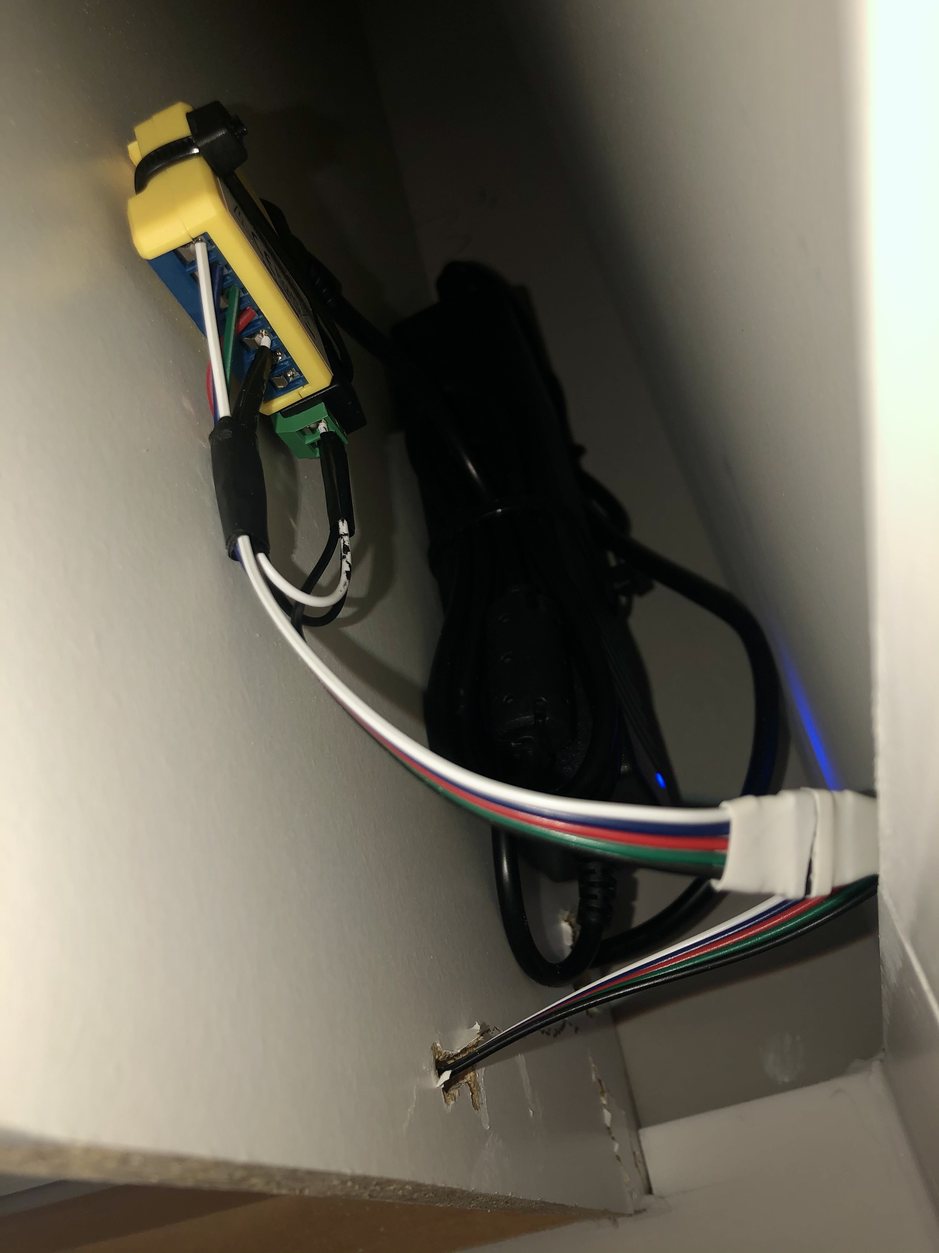 Time to make my first hole in our brand new cabinets 😬😱. I didn’t have a great tool for this, so I used a large drill bit to make a hole large enough for one end of the power supply cable to fit through. Once I had the cord through, I attached the power supply to the side of the cabinet with some velcro command strips. I used zip ties to gather the power cord, and secure the Shelly RBGW2 to the power supply. Next, I measured and marked holes to pass wires between cabinet sections then drilled those out with a smaller drill bit.