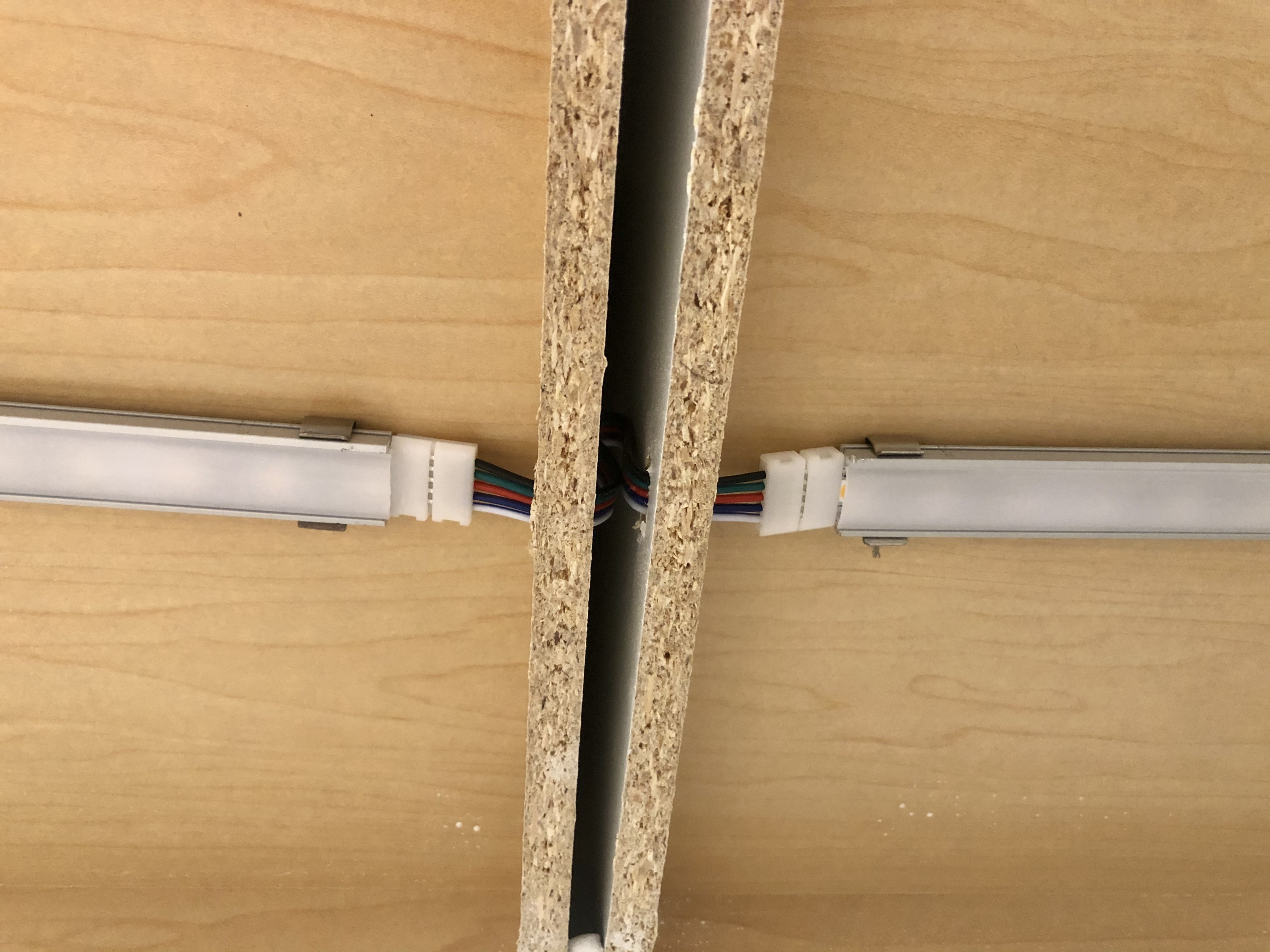 The next step was to make the connections between strips by using the plastic connectors in the wire kit I bought. These were pretty easy to hook up, but the connection wasn’t great. I used them like this for a while but I sometimes had to wiggle them to make a good connection, sections would randomly turn off, and one of the red, green or blue channels wouldn’t work. I lived with it like this for a little while, but eventually bought a soldering iron and soldered the connections instead. That was more work, but I’ve had no problems with the connections since I did that.