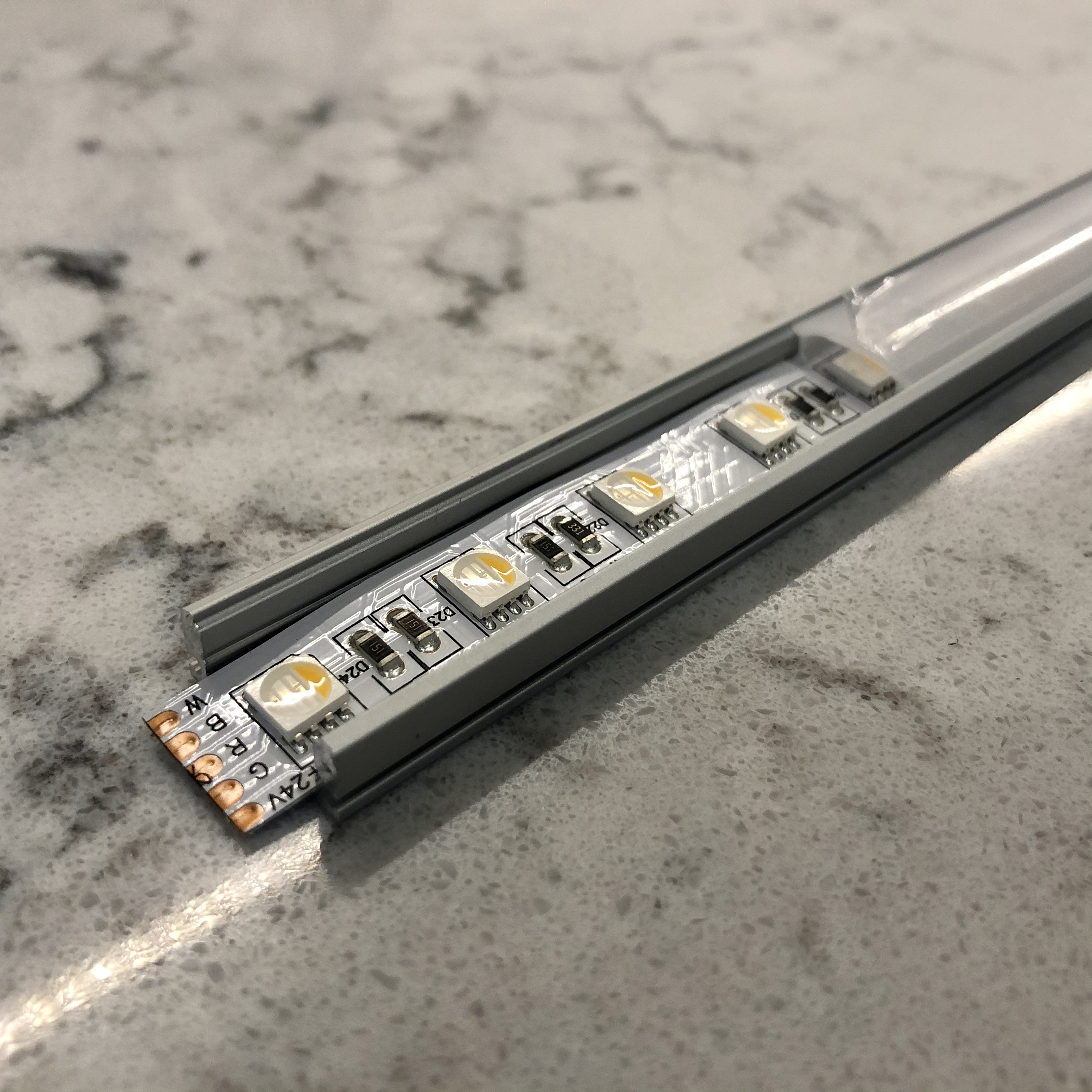 I don’t remember exactly how or why, but I chose these BTF Lighting LED strips. Again, I don’t have any experience with LED strips but for this project so far they’ve been pretty solid. I chose the 60 LEDs per meter strip because I wanted as much light as possible and a “smooth” look to the lights on the backsplash and counter. I also wanted the strips themselves to look like I didn’t piece this together myself so I picked up these aluminum channels with diffusers. To power everything, I got these 24V/5A power supply bricks that came with an adapter with screw terminals that made it easy to hook up to the Shelly.